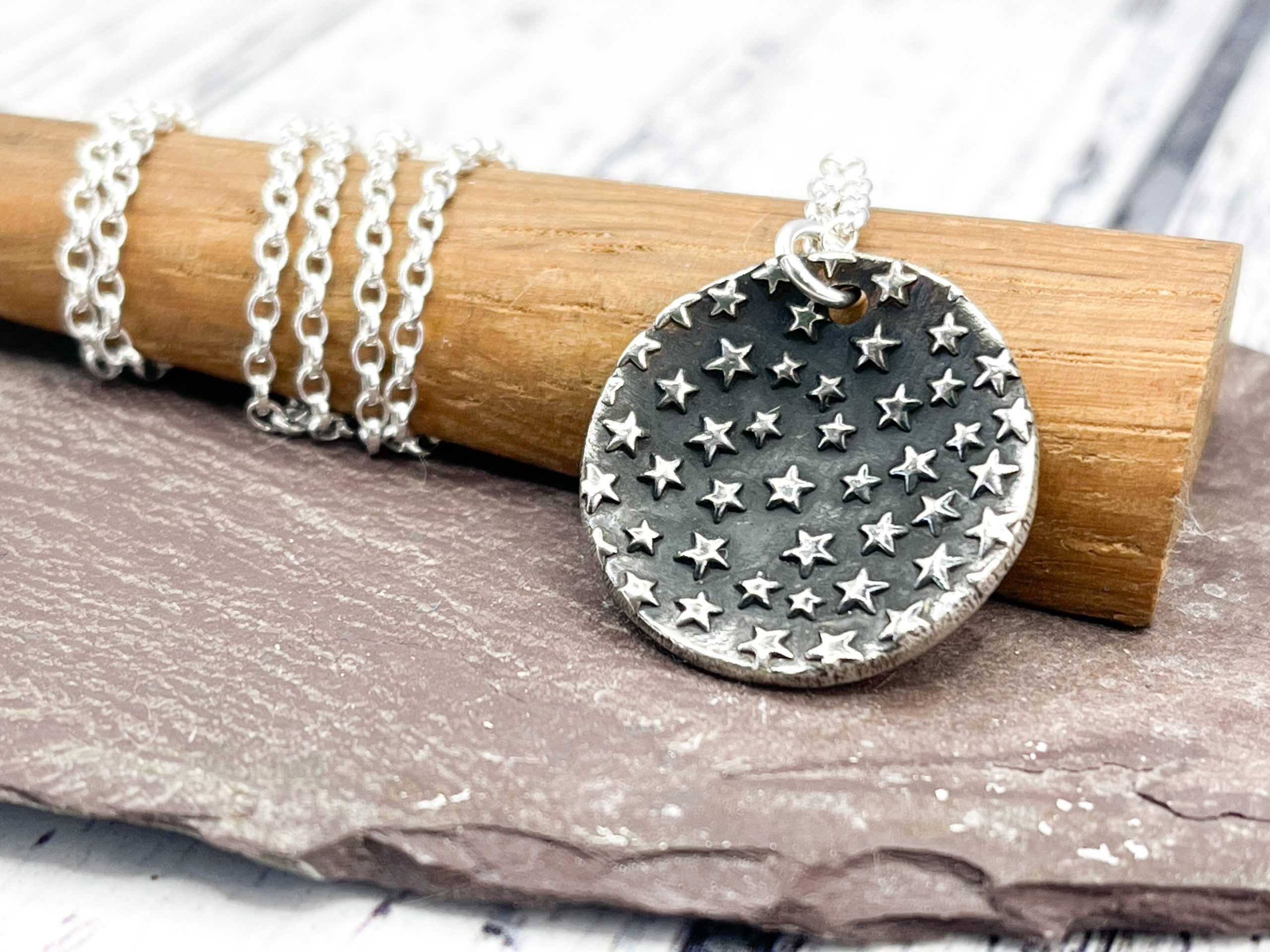 Fine silver oxidised star embossed necklace