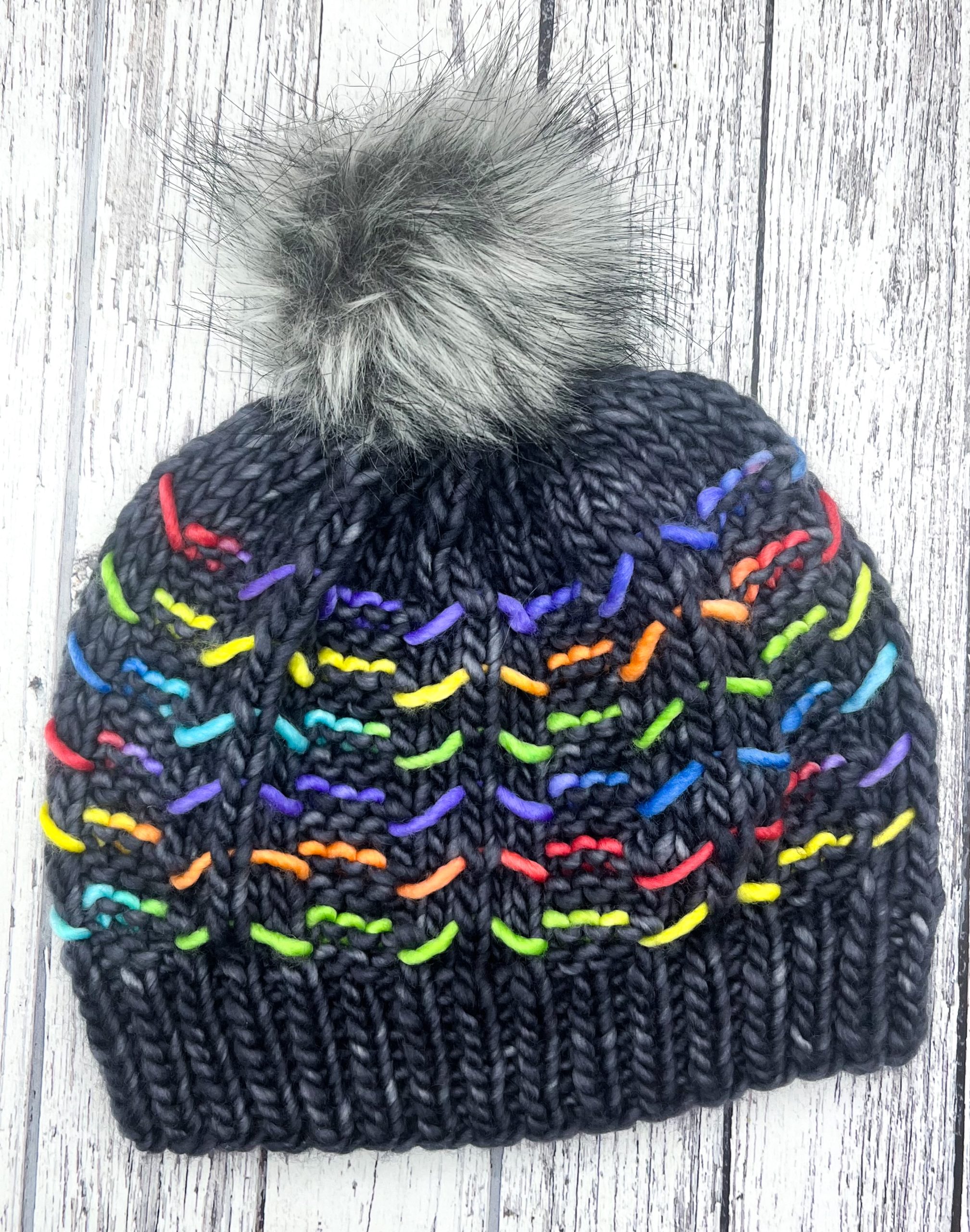 80% merino wool, 20% Nylon knitted hat in my handpainted Rainbow and Charcoal colourways and knitted to my own pattern.