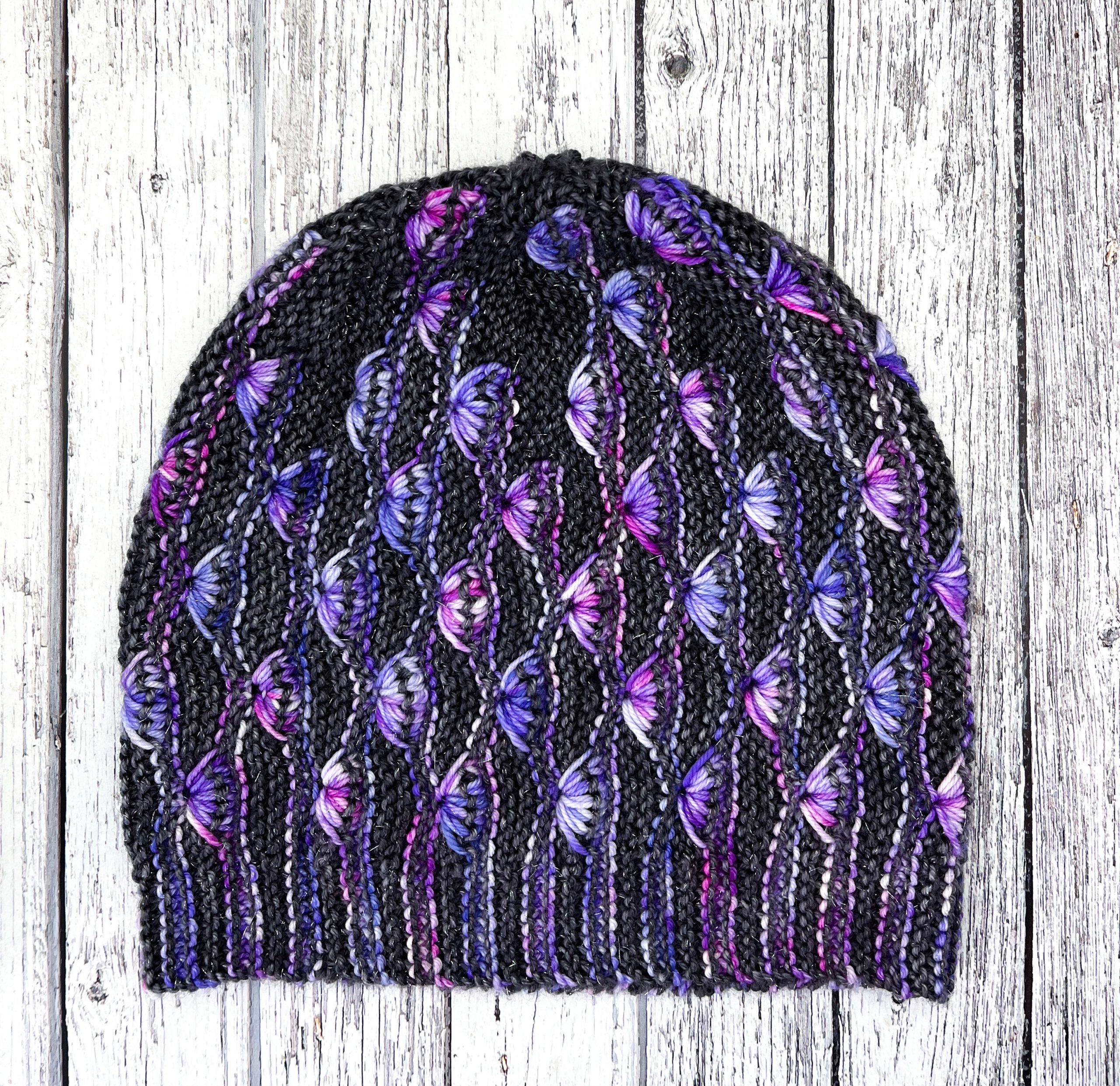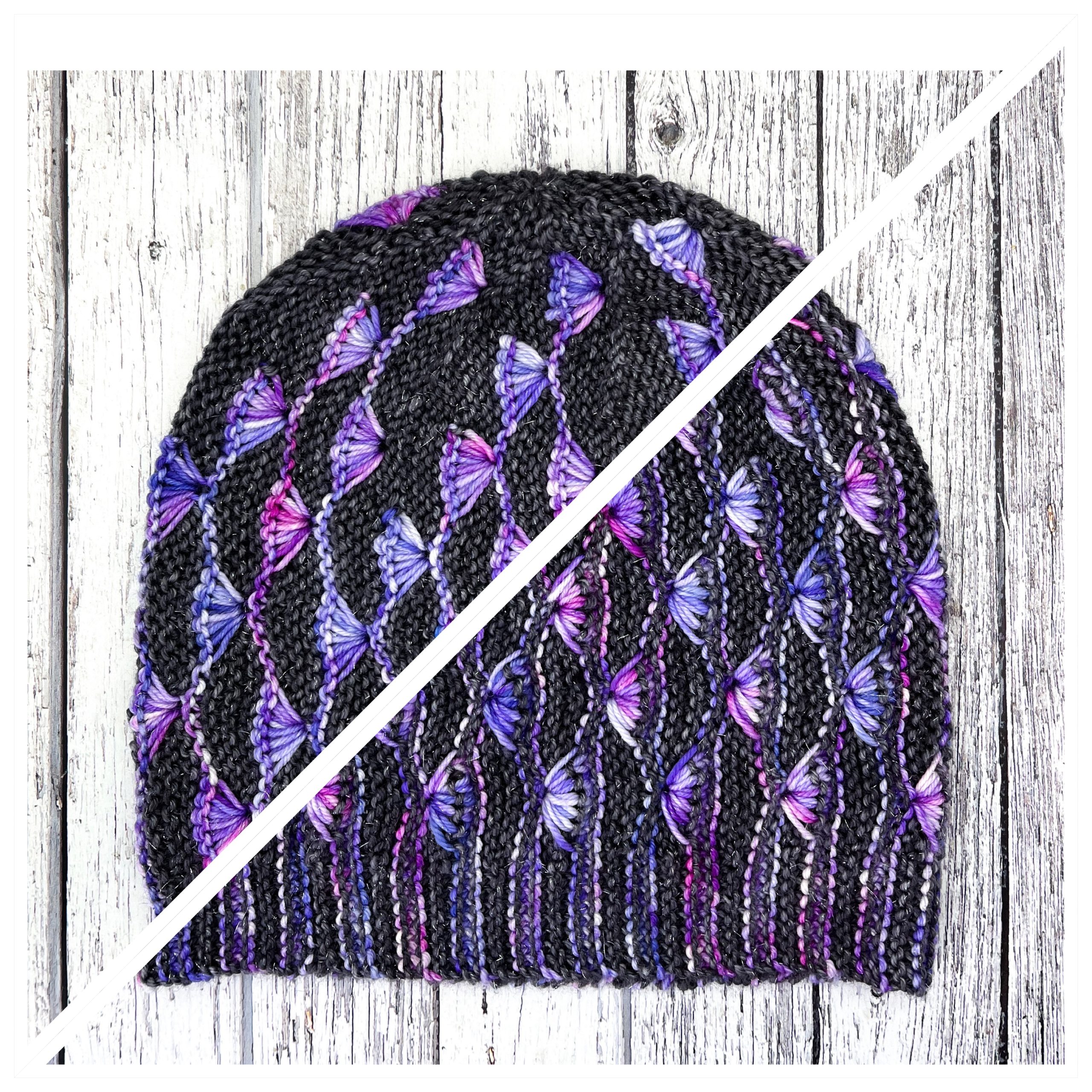 A reversible, unique hat knitted in 75% Merino wool which is slightly sparkly. Designed to be worn slouchy.